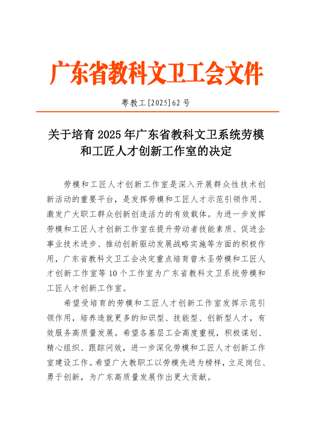 近日,广东省教科文卫工会发布了《关于培育2025年广东省教科文卫系统劳模和工匠人才创新工作室的决定》(粤教工〔2025〕62号),我校申报的“韦坤华劳模和工匠人才创新工作室”经过层层选拔,被确定为省教科文卫系统重点培育劳模和工匠人才创新工作室,这是我校在劳模创新平台建设上取得的新突破。