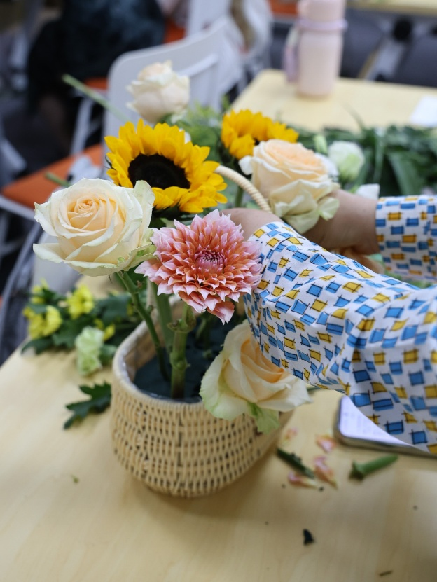 比赛现场花香四溢,气氛热烈而温馨,专业花艺师现场授课,一步步细致讲解、示范教学。参赛选手们充分发挥想象力与创造力,通过修剪、整枝、造型、色彩搭配等技巧,形成一件件构思巧妙、造型别致的插花作品,充分展现了我校女教职工的艺术修养。